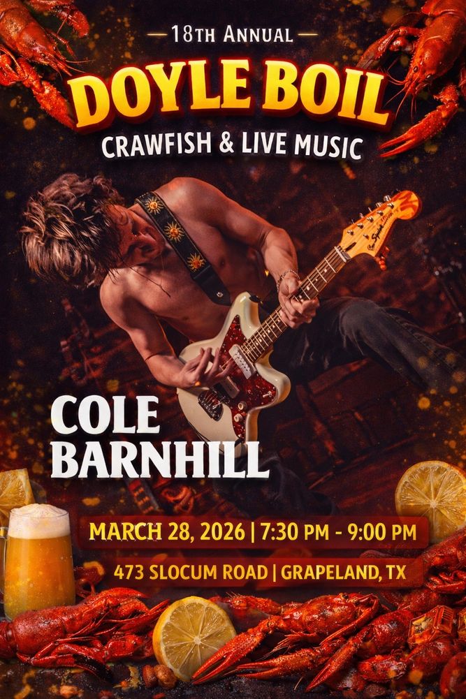 The 18th Annual Doyle Boil will take place at Pineyweeds in Slocum, TX on March 28, 2026, where we'll be serving hundreds of pounds of crawfish & hosting three amazing bands for your live music entertainment. Join us for our huge raffle & silent auction with door prizes, the always-popular cornhole tournament, food truck service before & after the crawfish boil, & much more! Come eat, congregate, listen to awesome music, & help us honor the memory & legacy of Doyle Marshall by supporting the Scholarship Fund. Bring your dancing shoes, your wallet, & a big appetite for mudbugs!